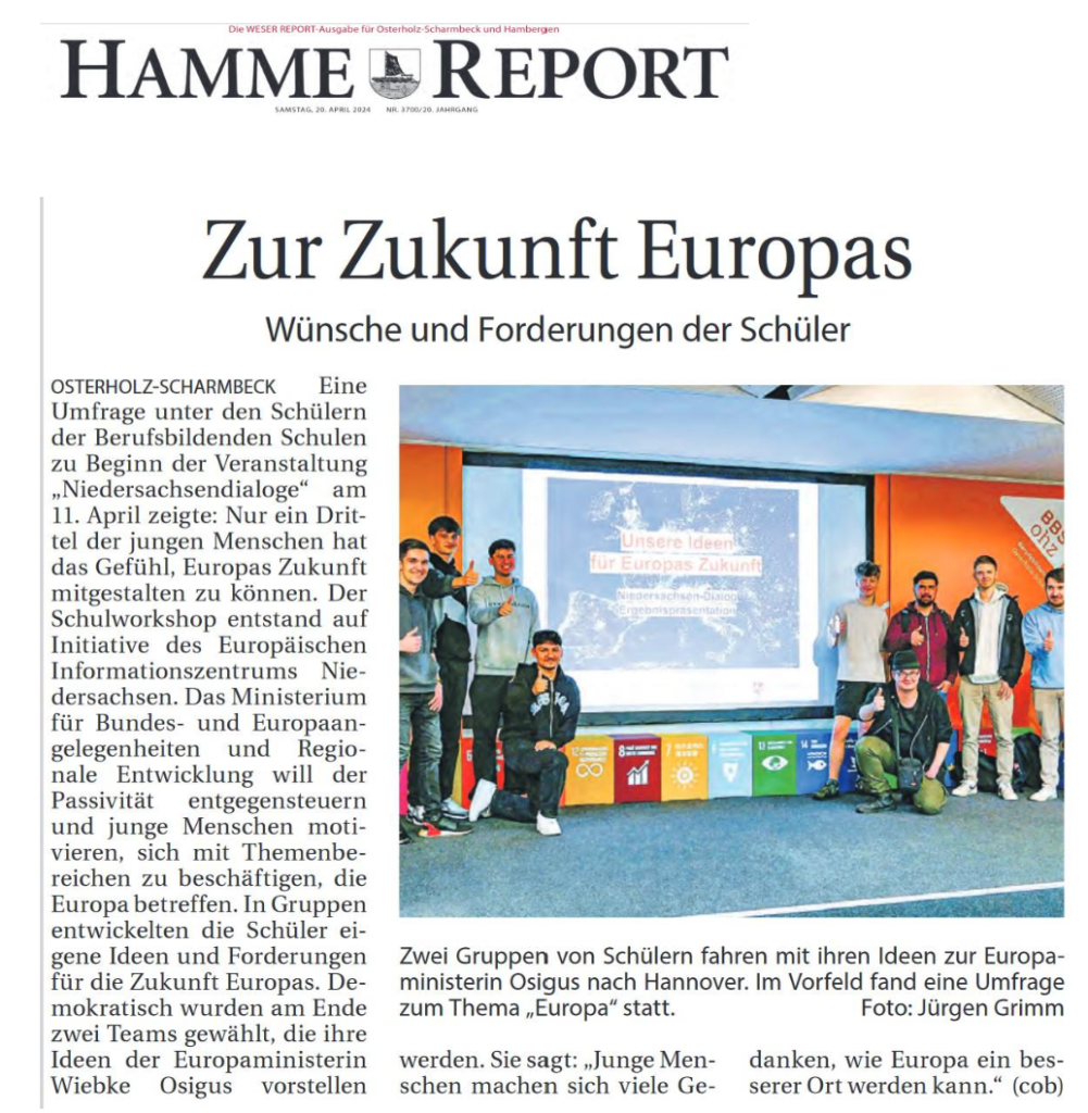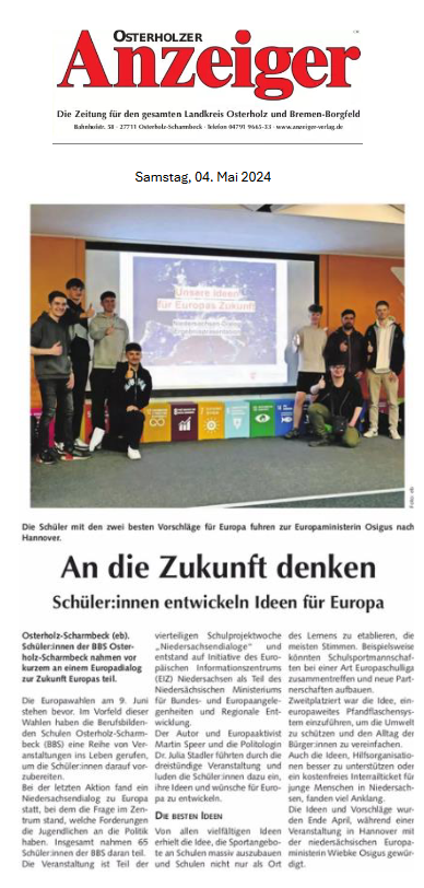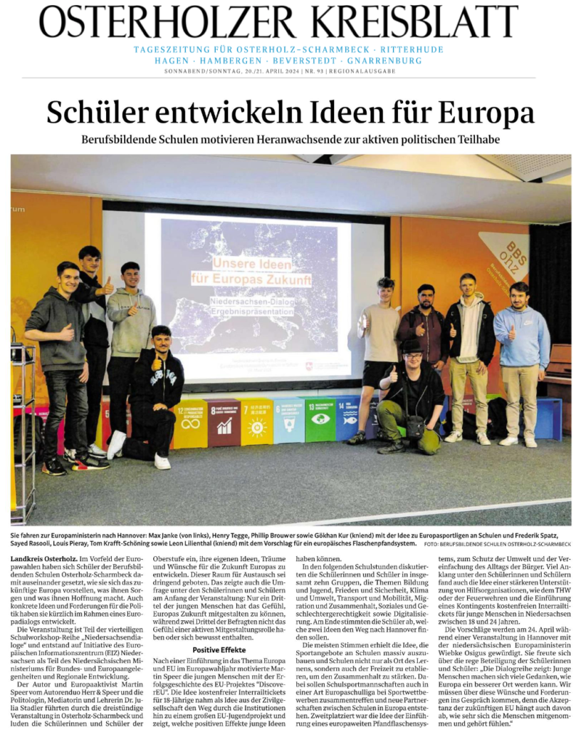 In welchem Europa wollen wir leben? Was macht uns Sorgen und was Hoffnungen? Welche konkreten Ideen und Forderungen haben wir an die Politik? Diese Fragen standen im Zentrum des Niedersachsendialogs zu Europa, an dem 65 Schülerinnen und Schüler an der BBS Osterholz-Scharmbeck beteiligten.