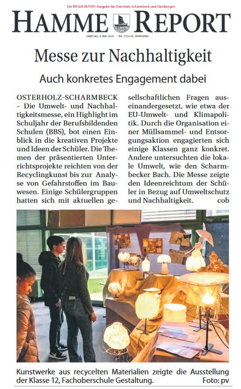 Ein besonderes Highlight der Messe war zweifellos die Lampenausstellung der Klasse 12 Fachoberschule Gestaltung. Die Schülerinnen und Schüler präsentierten beeindruckende Kunstwerke, die aus Altpapier und anderen recycelten Materialien gefertigt wurden und mit ihrem einzigartigen Design und Lichtspiel begeisterten.